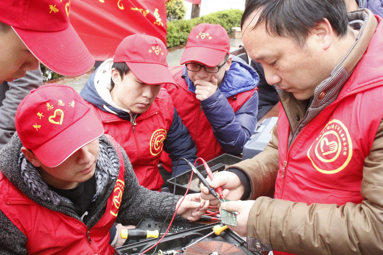 志愿者们热心地接待了每一位前来咨询的社区居民,在江兴刚老师的指导下,志愿者们仔细排查电器存在的故障,针对故障逐一进行维修,并向居民说明故障发生的原因。对于暂时无法维修的电器,志愿者们则指出需要更换的零部件并进行详细说明。维修好的电器一个个被送到居民手中,居民向志愿者们竖起了大拇指。