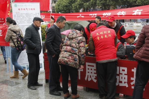 阴雨的天气并没有阻止同学们为居民服务的热情,我院电子协会20多名志愿者们在指导老师江兴刚、系部副主任钟峰、系团总支书记易辉君的带领下,来到佳惠超市前设置好便民服务点。他们准备好了桌椅和维修工具,拉横幅,做宣传,不一会儿就有居民前来咨询。在协会志愿者的热情解说下,居民们纷纷带着有问题的电视机、电风扇、电饭煲、电磁炉等家电前来维修。